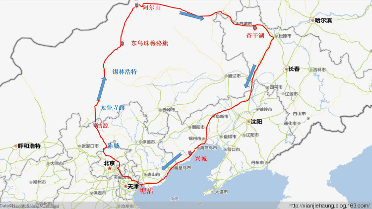 天津---张北草原---锡林郭勒草原---西乌旗草原---乌拉盖草原---鲁北---天山---大板---玉龙沙湖---喀喇沁王府---赤峰---锦州---秦皇岛---天津