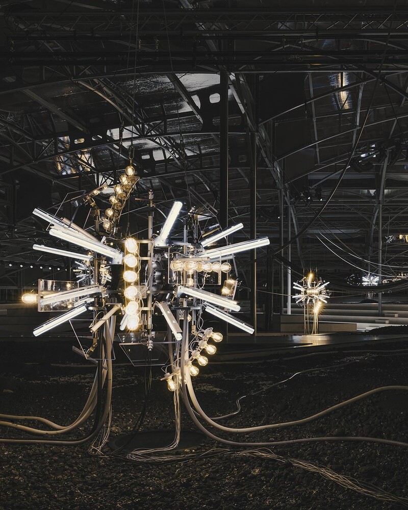 秀场装置是由碎黑板岩、矿物质、盐晶体和玻璃等多种材质精心打造。 充满未来感的科技版水晶灯。 秀台的正中央是一座会发光的母体,随着音乐节奏忽明忽暗。 在罗浮宫盖一座未来堡垒