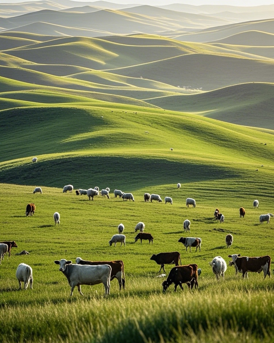 锡林郭勒草原是“草原天堂”,有多种草原类型,还藏着洪格尔岩画、元上都遗址等古迹,金秋时黄绿相间,牛群羊群悠然,草垛似“瑞士卷”。